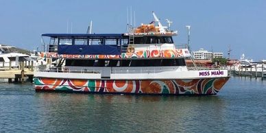 Welcome aboard the classiest sightseeing boat on Biscayne Bay. This elegant vessel features a beautifully decorated main salon with maximalist interior design and a dreamy open-air terrace—perfect for enjoying the views.
